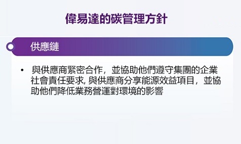 偉易達在業務連續性管理服務、 供應鏈管理及氣候變化策略方面有完善的政策和系統, 以確保公司可持續營運實務的推行。
